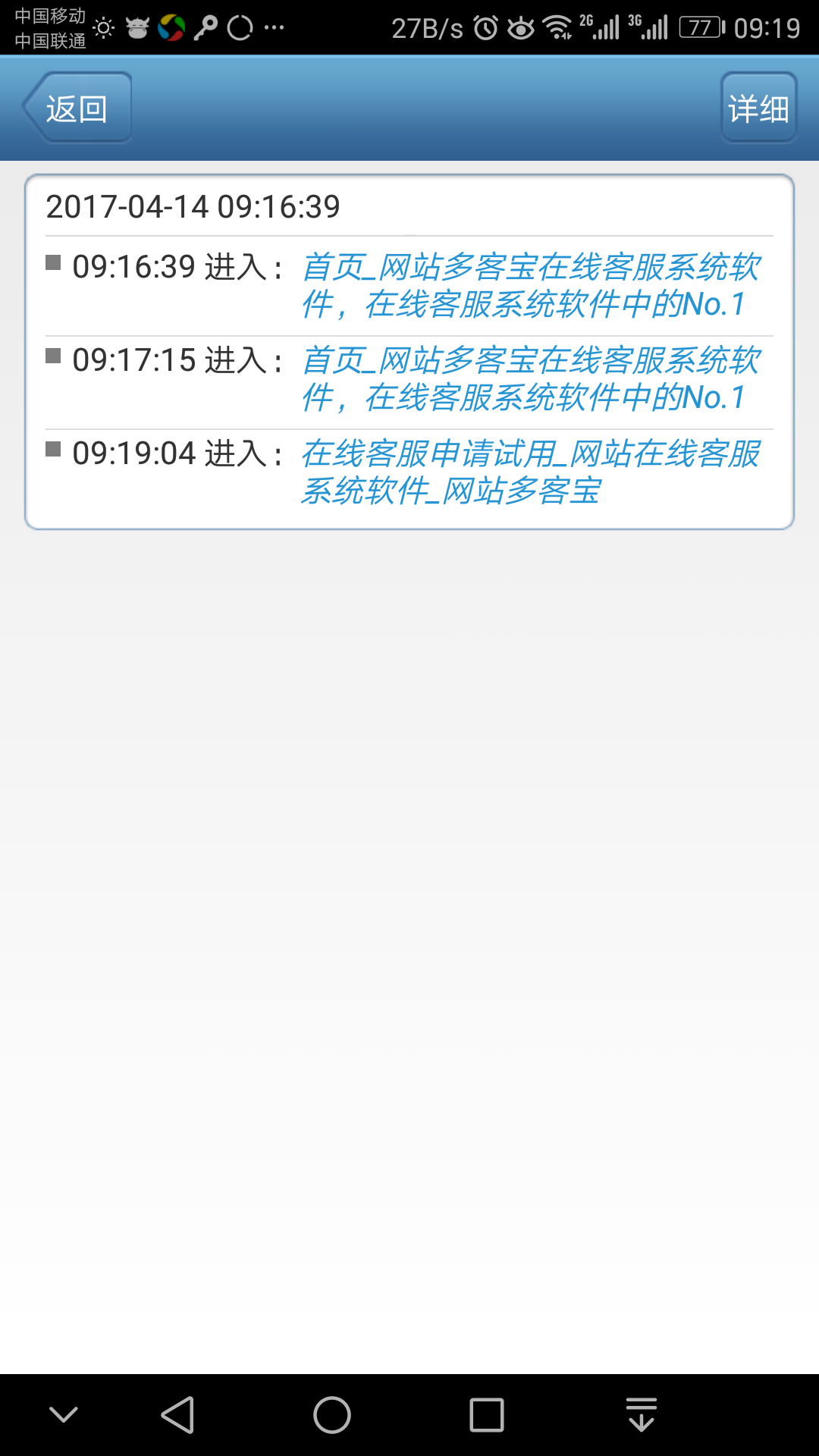 移动互联的发展让人们的生活更加便利,无论是购物、吃饭、游戏、出行,一个手机就可以解决一切。现在更多的工作也可以用手机去处理,比如手机版在线客服软件。 网站的在线客服工作人员不方便用电脑办公时,可以用手机登录手机版在线客服软件网站多客宝,即可实时监控网站访客的浏览情况并进行在线解答。 登录手机客服系统后,可以如下图所示设置在线客服人员的工作状态: 可以通过手机客服系统网站多客宝的后台看到实时在线的访客情况和他们的浏览轨迹,如下图所示: 在线客服人员可以设置快捷回复,方便更及时准确地为访客提供服务。如下图所示: 或者如果客户咨询的问题不属于自己所属范围内的时候,可以通过点击下拉键选择所对应的部门的客服人员的快捷回复发送给访客