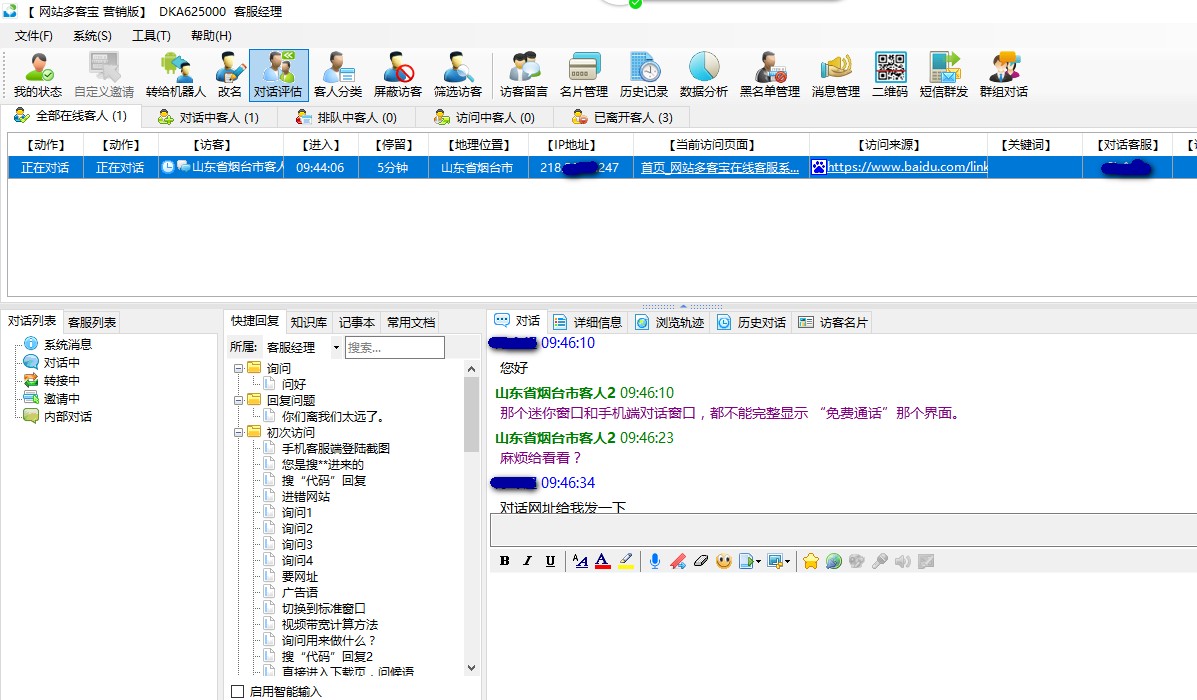 在线客服系统顾名思义就是网站客服与网站访客在线进行沟通的一个工具。如果只用传统的QQ聊天工具,是满足不了对于网站的监控的,也达不到网络营销的效果。只有用了在线聊天系统网站多客宝,才能通过多客宝的后台监控访客的动态,比如他们是搜索什么关键字进入到网站的、在每个页面停留了多长时间,对于哪个产品更感兴趣,对于哪篇文章浏览的更多,来自于什么地区等等与访客有关的网络信息都会显示在网站多客宝的后台。