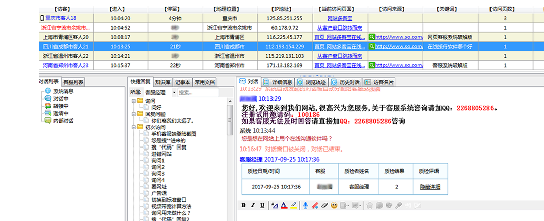 对于平台型网站的管理,最重要的一部分就是客服人员的管理。客服人员接待访客的质量好坏直接影响着这个网站的流量甚至销 量。下面就来详解一下网站多客宝在线客服软件里对于客服管理的合理设置。 客服经理登陆后台后,可以随机查看任何一个客服的接待记录,选中一个记录后就可点击对话质检功能,即可对该对话评分或者 评语。评价后,客服人员即时收到信息提醒,可以看到客服经理对自己的评价,以便后续更好的开展工作。 客服经理对于客服人员的评价,在高级管理人员的后台上都会有显示,这样递进的管理模式,使客服管理这项工作更严谨的开展 。提高了客服管理的工作质量,就是网站得以健康运用的基本保障。