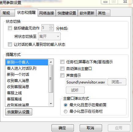 现在的客服人员每天接待不同的客户,电脑上都会开着很多种聊天软件,每一个都在不停地闪烁消息,但是很多消息是群发的,或者系统自动回复的,客服无法分辨。但是客服系统网站多客宝的后台可以帮您过滤掉没有用的消息。 打开工具--使用参数设置 在这里可以设置只有放访客主动发消息,才会有提醒,这样就避免了,来一个访客系统就提示一次的问题,可以充分利用客服的时间去处理更有价值的工作。