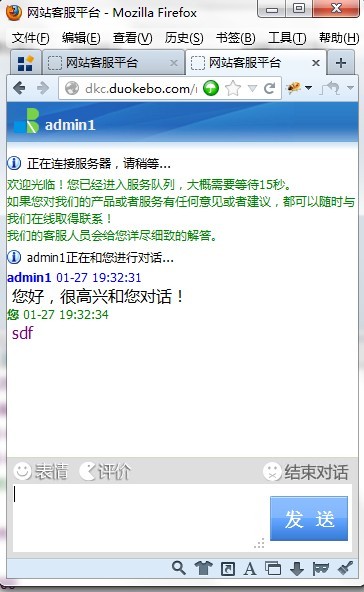 网站多客宝在线客服软件 V1.2.4.2版本 已于2013-1-27升级完毕,升级内容: * 新增加了访客端界面繁体语言支持; * 新增加了手机版本的网页对话窗口; * 修复了网页对话窗口在收到客服消息后要重新点击才能输入的问题; * 修复了客服同时有多个对话时,当某访客结束对话后导致客服端的对话窗口被自动切换的问题; * 修复了过期后的浮动图标沉底的问题; * 修复了迷你对话窗口在IE6下工具栏图标显示不正常问题;