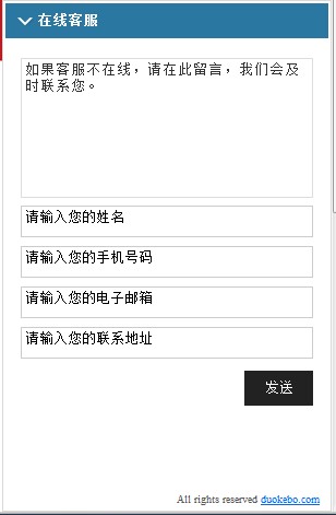 网站多客宝在线客服软件 V1.2.6.9 版本 已于2013-9-16 升级完毕,升级内容: * 新增欧式迷你窗口; 列表状态 对话状态 留言状态 * 新增俄语版访客端 * 新增客服端客服头像设置 * 新增页面标签新消息提醒功能 * 新增折点图统计、条形图统计在各个分类统计页面中。 * 调整优化电子白板功能 * 修正部分其他软件问题