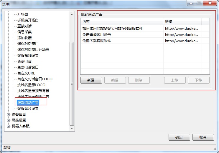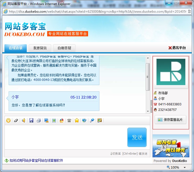 网站多客宝在线客服软件 V1.2.8.1 版本 已于2014-5-12 升级完毕,升级内容: 1.新增客服端翻译功能,支持多种语言实时翻译; 2.新增访客对话窗口底部滚动广告功能; 3.新增客服端窗口底部滚动广告设置功能; 4.新增对话窗口显示客服名片功能; 5.新增客服端窗口客服信息显示设置功能 6.新增客服端转接对话界面显示客服当前状态; 7.修复免费电话验证码位数问题