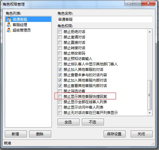 8.客服端新增--【系统-客服管理-角色权限管理】新增禁止显示其他客服快捷回复选项。