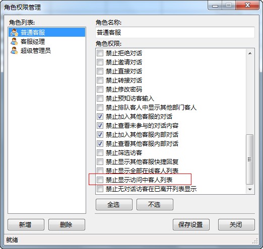 9.客服端新增--【系统-客服管理-角色权限管理】新增禁止显示访问中客人列表选项
