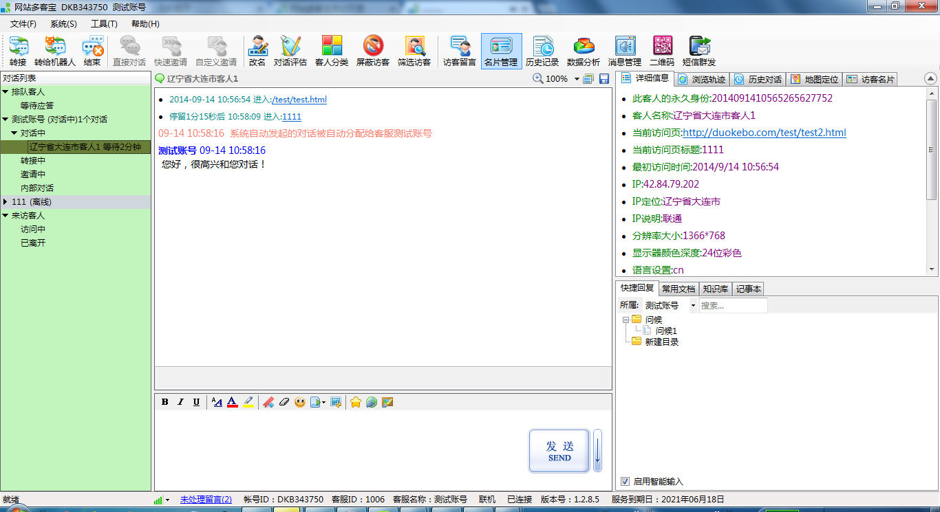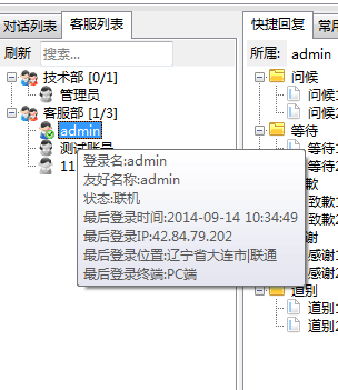 网站多客宝在线客服软件 V1.2.8.5 版本 已于2014-9-15 升级完毕,升级内容: 1.客服端新增--【工具-使用参数设置-常规】新增“主窗口工具栏隐藏按钮文本”设置 启用“主窗口工具栏隐藏按钮文本”功能后的效果 2.客服端新增--【客服列表】新增客服最后登陆信息提示功能 3.最新推出新版客服端,【网站多客宝极速版在线客服操作平台】 4.客服端优化及提升客服端响应速度