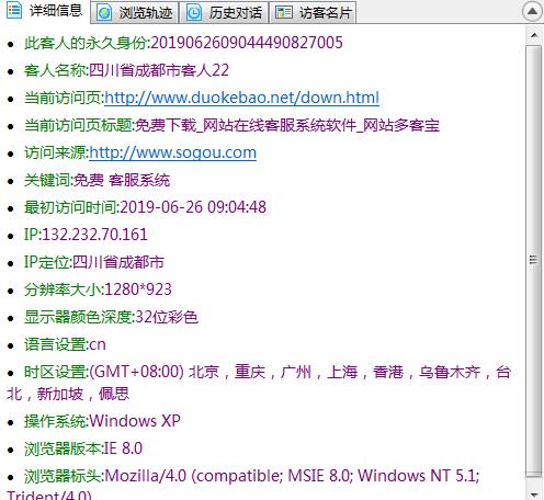 流量统计工具比在线客服系统更早诞生,但是网站主不可能实时去流量统计后台查看数据,有顾客来访我们也不知道,这也是推动在线客服系统诞生的一个原因。获取访客信息是在线客服系统的一项基本功能。当有访客打开网站后,客服系统就可以抓取访客的相关信息如IP、地区、来源、搜索引擎、搜索关键词、浏览器型号、操作系统型号、是否回头客等等,下图是网站多客宝抓取的访客信息: